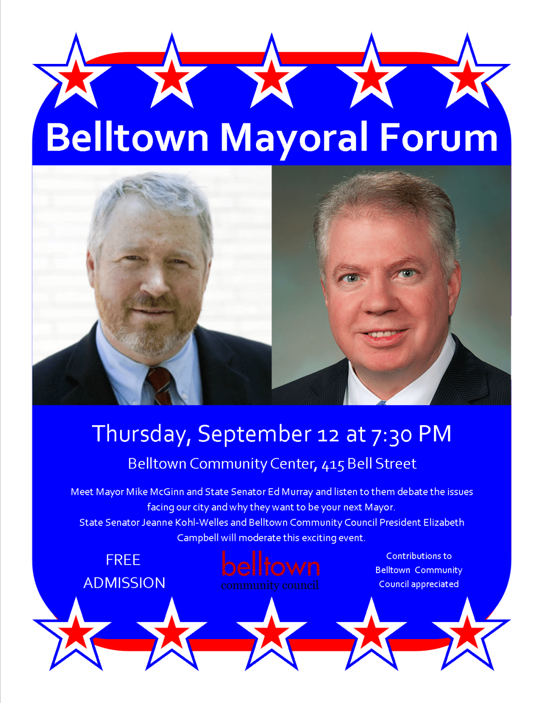 Join the Belltown Community Council for a debate between Mayoral candidates Ed Murray and Mike McGinn.